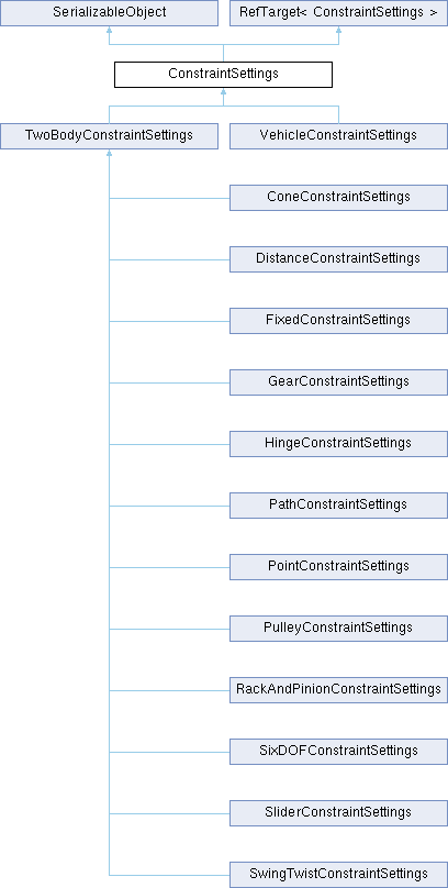 Reimplemented in ConeConstraintSettings, DistanceConstraintSettings, FixedConstraintSettings, GearConstraintSettings, HingeConstraintSettings, PathConstraintSettings, PointConstraintSettings, PulleyConstraintSettings, RackAndPinionConstraintSettings, SixDOFConstraintSettings, SliderConstraintSettings, SwingTwistConstraintSettings, and VehicleConstraintSettings.