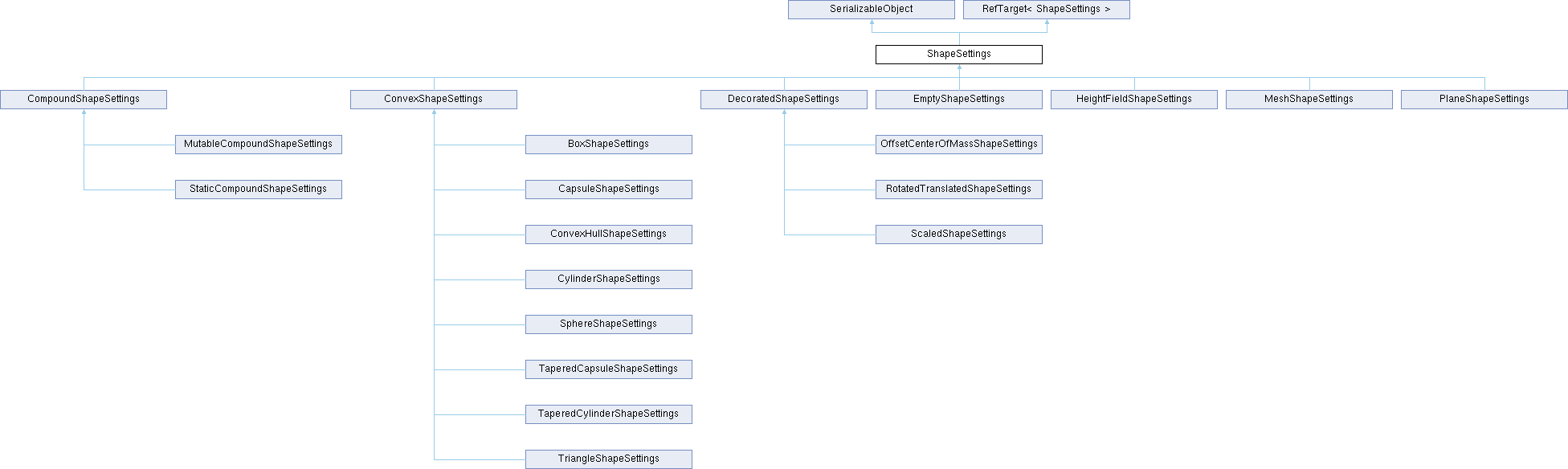 Implemented in BoxShapeSettings, CapsuleShapeSettings, ConvexHullShapeSettings, CylinderShapeSettings, EmptyShapeSettings, HeightFieldShapeSettings, MeshShapeSettings, MutableCompoundShapeSettings, OffsetCenterOfMassShapeSettings, PlaneShapeSettings, RotatedTranslatedShapeSettings, ScaledShapeSettings, SphereShapeSettings, StaticCompoundShapeSettings, TaperedCapsuleShapeSettings, TaperedCylinderShapeSettings, and TriangleShapeSettings.